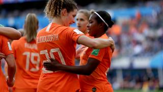 20 juni 2019: Dominique Janssen - destijds spelend onder haar getrouwde naam Bloodworth - feliciteert Lineth Beerensteyn met haar treffer. Het was de enige keer in de historie dat Oranje van Canada wist te winnen. In de groepsfase van het WK in Frankrijk.