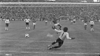 De penalty van Johan Neeskens in de WK-finale van 1974, snoeihard dwars door het midden.